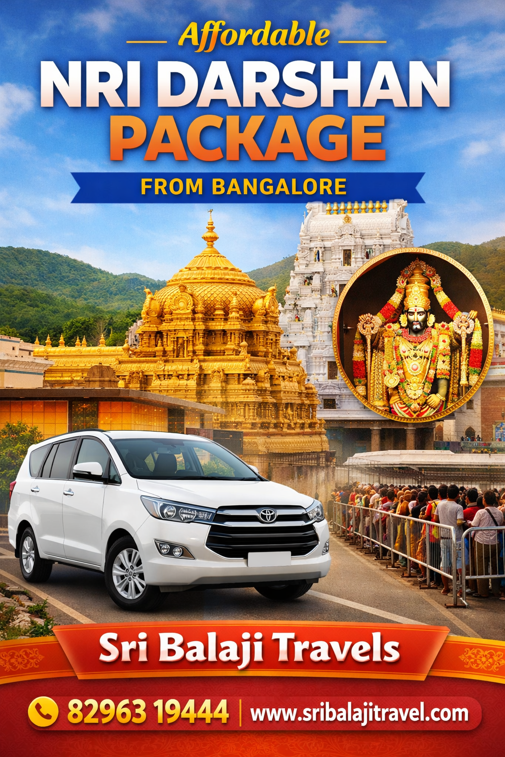 Experience a peaceful and divine journey with Sri Balaji Travels. Whether you are planning a Bangalore to Tirupati Temple NRI Darshan Package or a quick Bangalore to Tirupati NRI Darshan Package, we ensure comfort, reliability, and spiritual satisfaction.