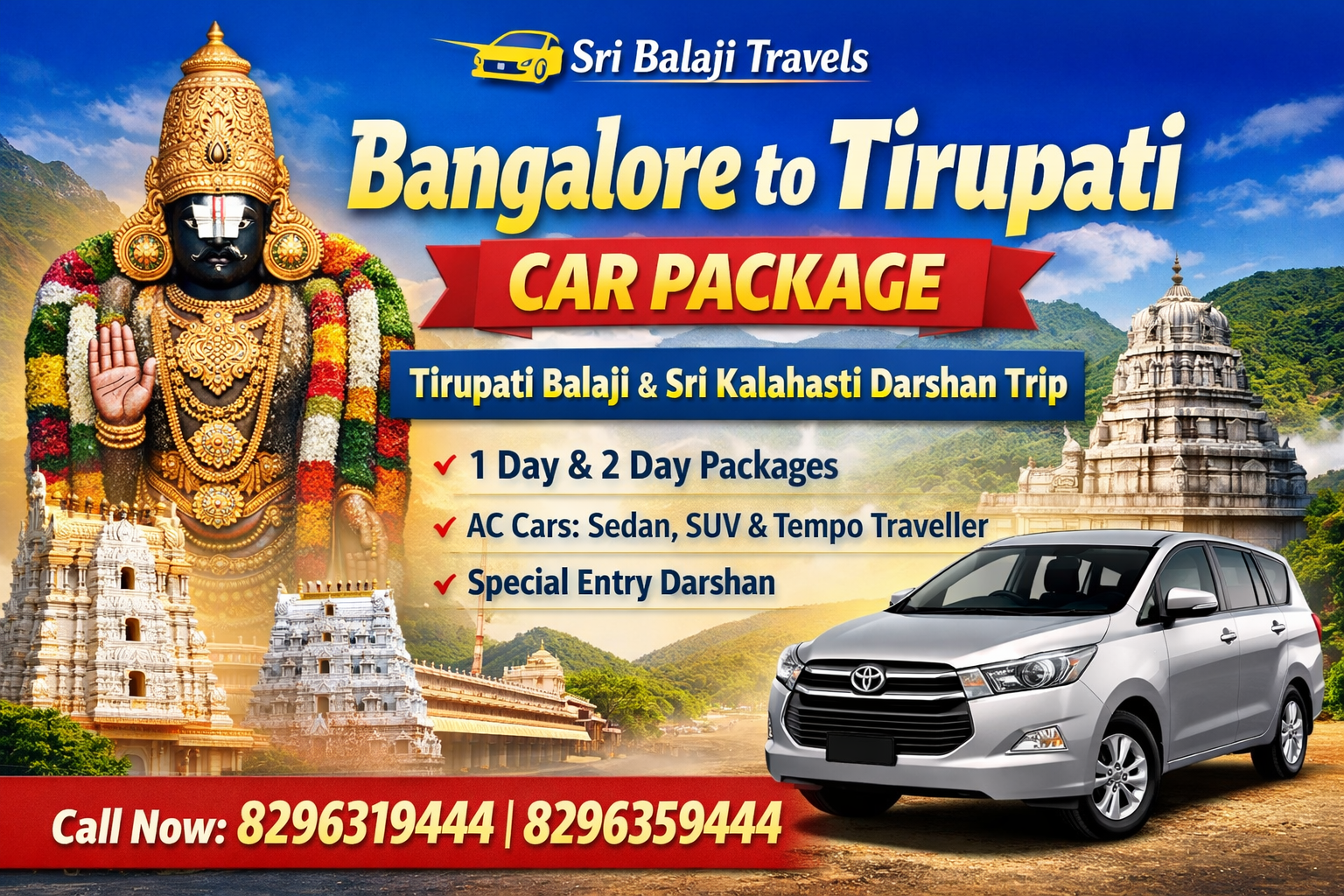 Contact Sri Balaji Travels today and experience a comfortable, devotion-filled Bangalore to Tirupati car package designed just for you.
