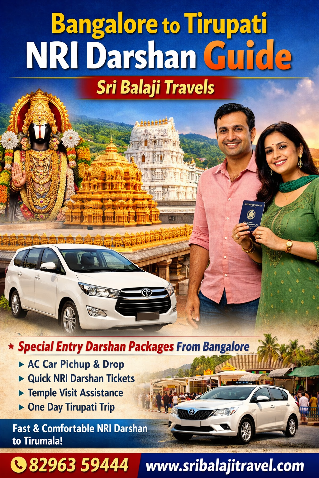 The easiest way is to book a Tirupati NRI Darshan Package with car from Bangalore. Travel providers like Sri Balaji Travels offer Bangalore to Tirupati NRI Darshan packages with pickup and drop, ensuring a smooth journey and proper guidance for NRI Entry Darshan Tirumala.
