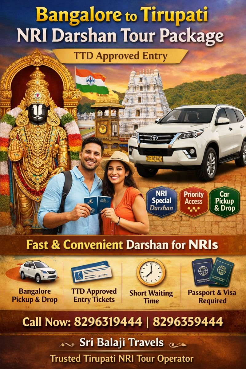 With Sri Balaji Travels, NRIs can book a complete Tirupati NRI Darshan Package from Bangalore, including NRI special entry tickets, car pickup & drop, and expert guidance.
