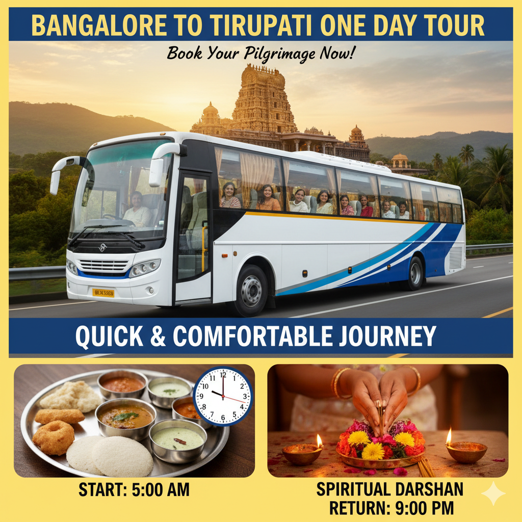 Looking for a divine getaway that fits perfectly into your busy schedule? The Bangalore to Tirupati One Day Tour is the ideal choice for devotees seeking a quick, comfortable, and spiritual journey to seek blessings from Lord Sri Venkateswara at Tirumala. Whether you are traveling with family or friends, this one-day trip ensures a smooth darshan experience without compromising on comfort or devotion.