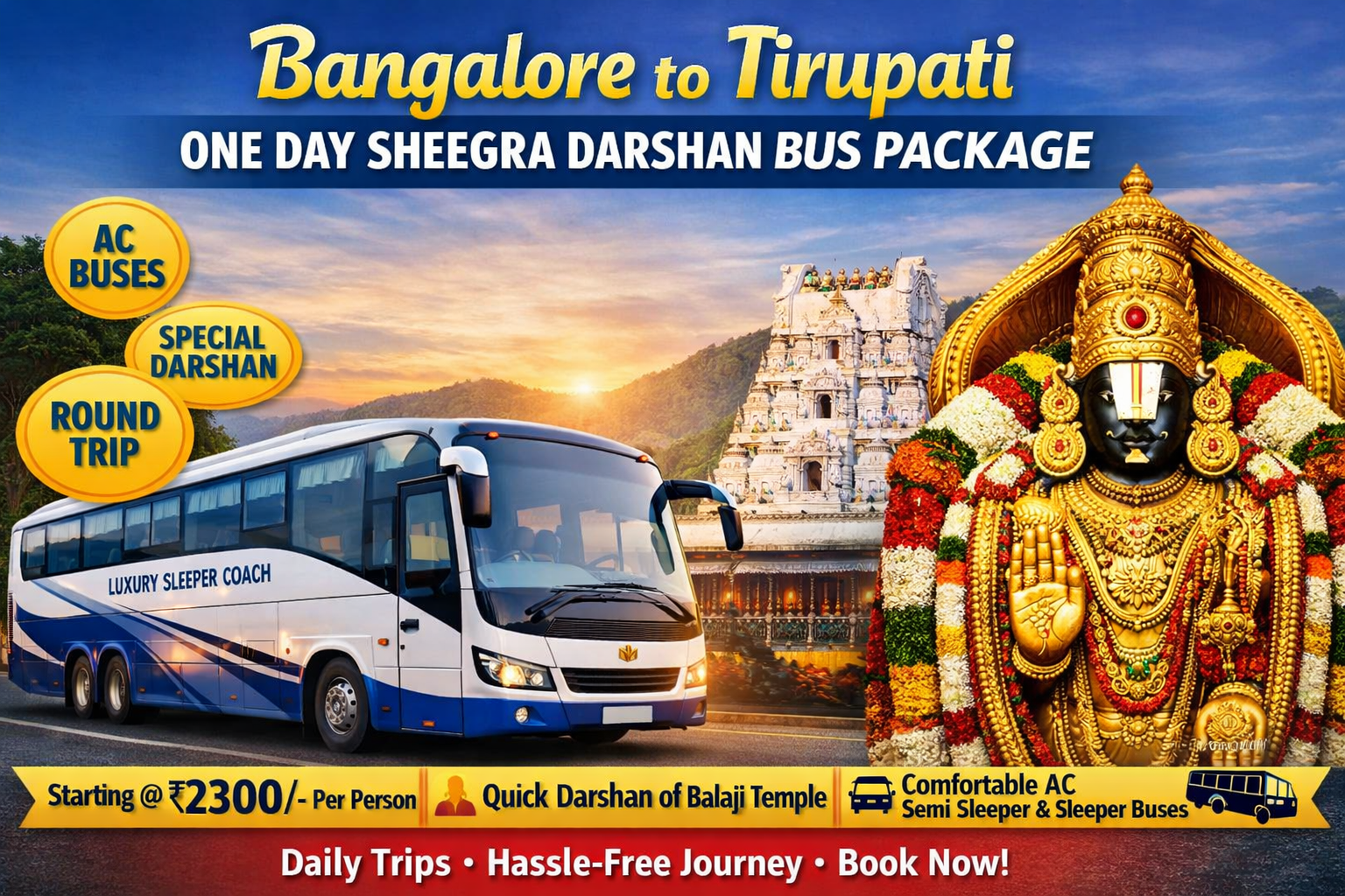 Avoid long queues and travel stress. Choose a trusted Bangalore to Tirupati Balaji darshan package by bus and experience the blessings of Lord Venkateswara in just one day.