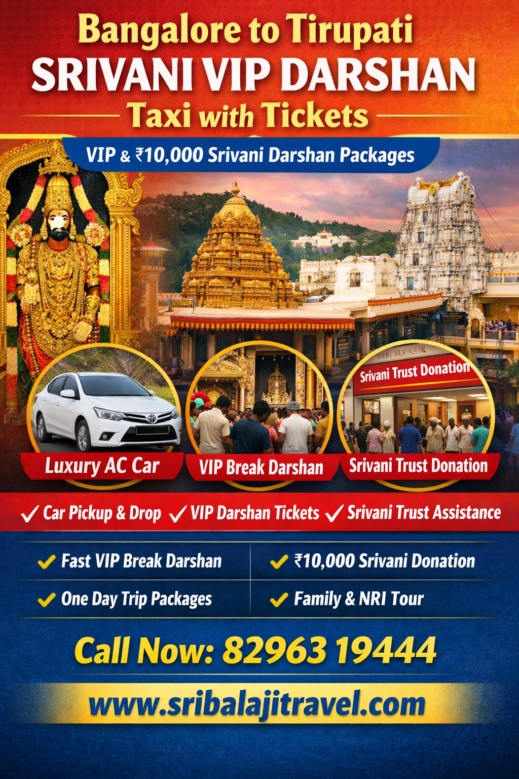 With Sri Balaji Travels, you get a complete Bangalore to Tirupati Srivani VIP Darshan experience including car pickup, Srivani Trust donation assistance, and VIP Break Darshan tickets.