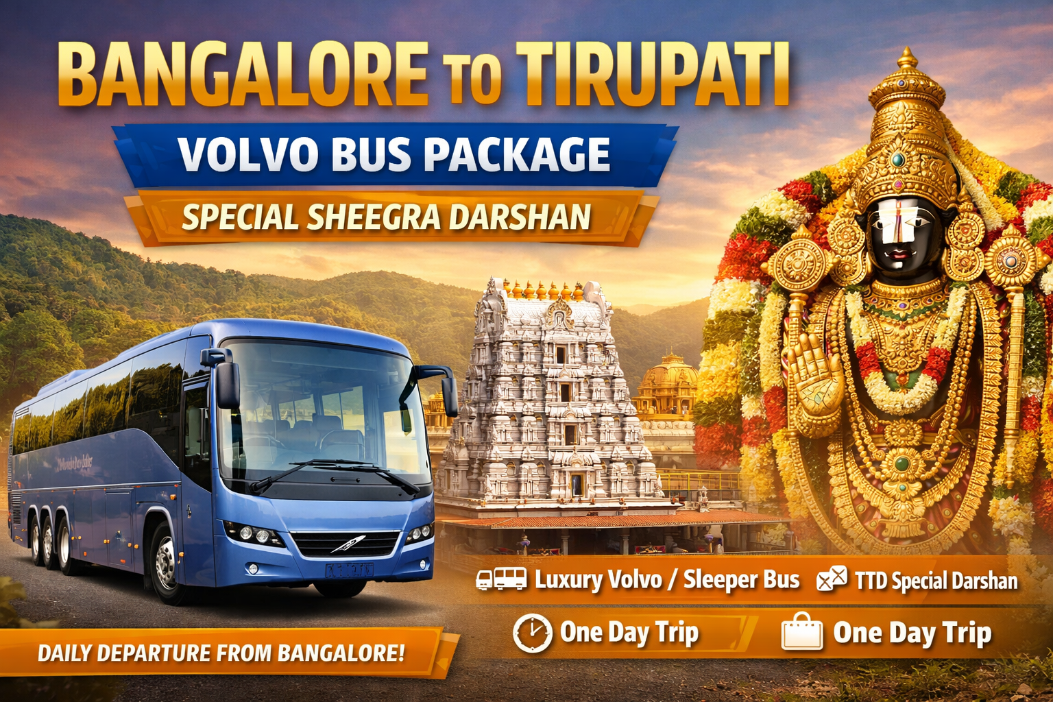 Planning a divine getaway to seek the blessings of Lord Venkateswara at Tirumala? Our Bangalore to Tirupati Volvo Bus Package is the most convenient and affordable option for devotees looking for a one-day Tirupati darshan package from Bangalore by bus with Special / Sheegra Darshan.