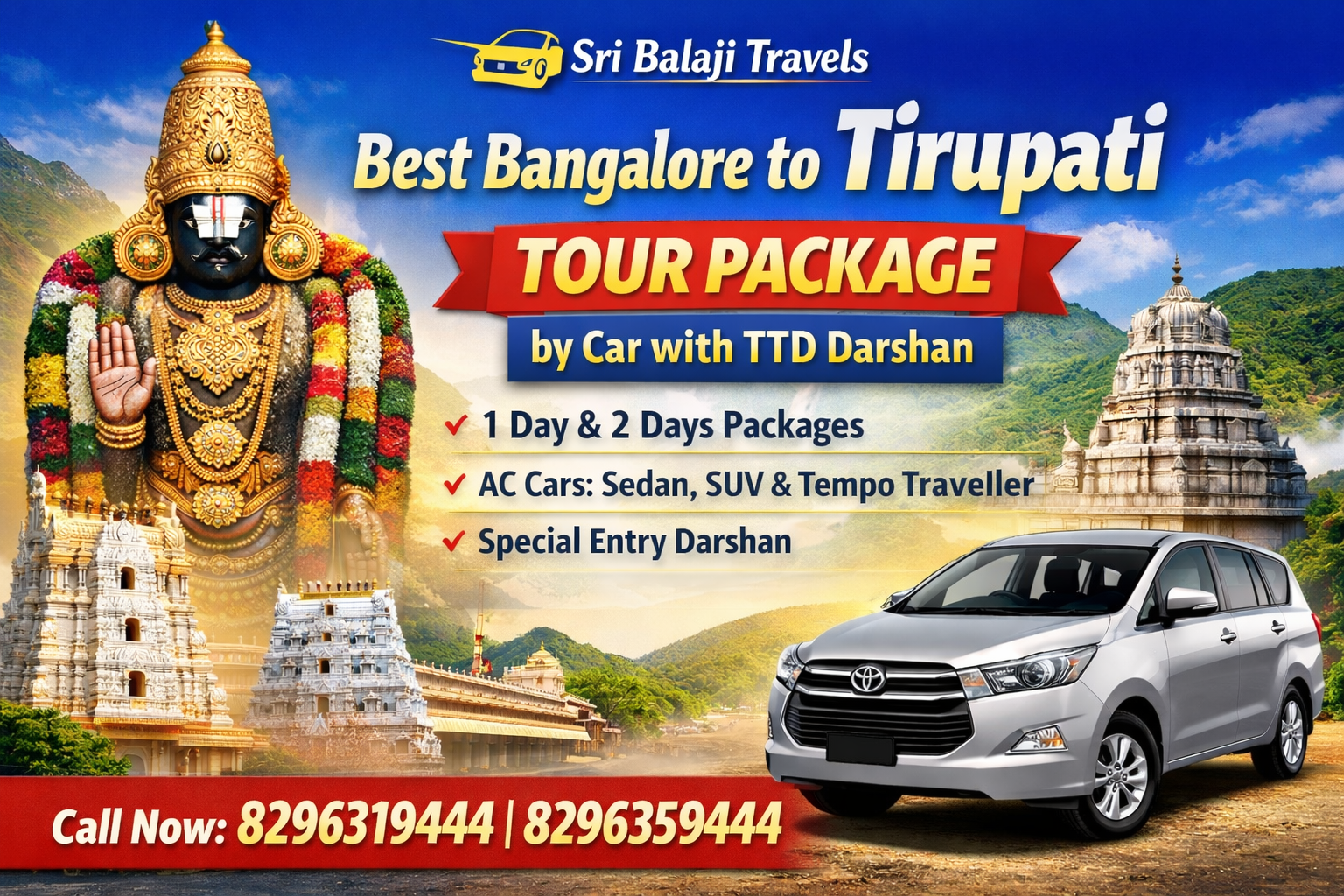 Book your Best Bangalore to Tirupati Tour Package by Car with TTD Darshan with Sri Balaji Travels and experience a smooth, divine, and memorable journey to Lord Venkateswara’s holy abode.