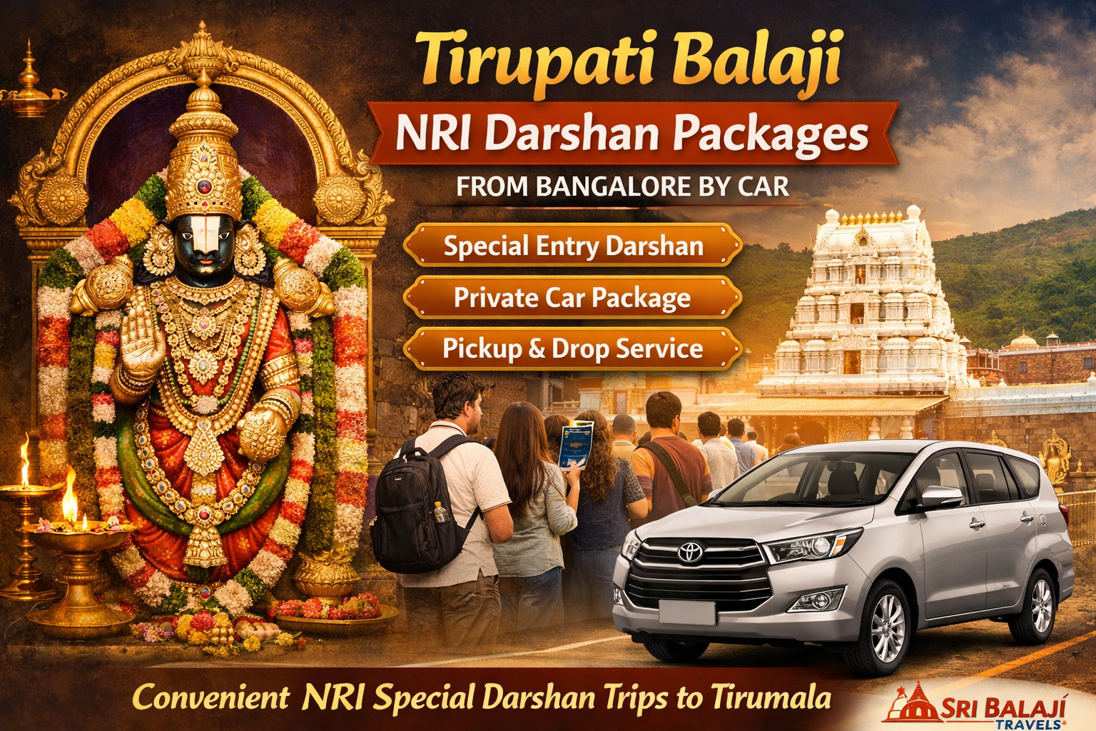 Whether you are planning a Bangalore to Tirupati Temple NRI Darshan Package, a Tirupati Balaji NRI Darshan Package by Car from Bangalore, or a Bangalore to Tirupati NRI Entry Darshan Tour, Sri Balaji Travels is your trusted partner.