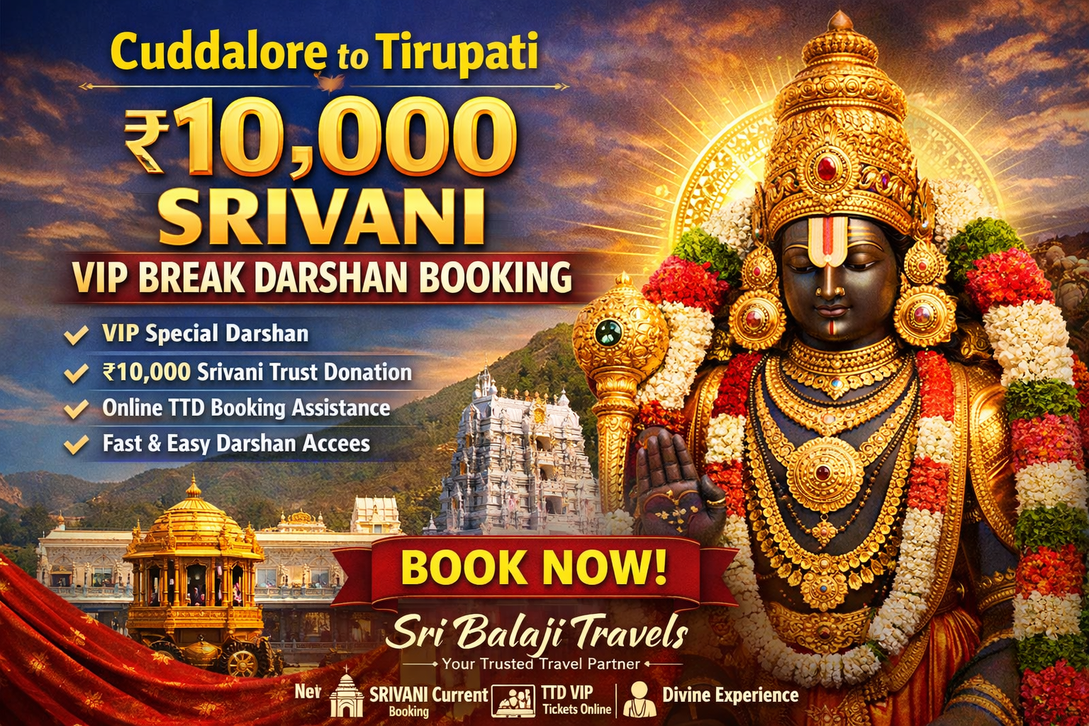 For devotees from Tamil Nadu seeking a VIP Tirupati Darshan with minimal waiting time, the SRIVANI ₹10,000 VIP Break Darshan is one of the most trusted options approved by TTD. With Sri Balaji Travels, devotees from Cuddalore to Tirupati can now book SRIVANI VIP Break Darshan tickets online easily through the online SRIVANI current booking system.