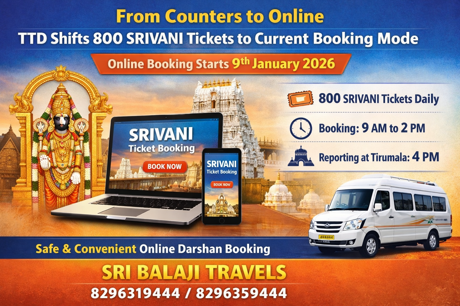 Keeping in view the convenience of devotees, the Tirumala Tirupati Devasthanams (TTD) has taken a significant step by introducing an online current booking system for SRIVANI Trust darshan tickets on a trial basis. This new facility will come into effect from 9th January 2026 onwards, marking a major shift from traditional counter-based bookings to a fully digital process.