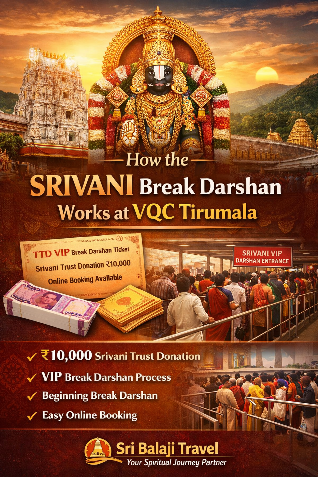 In this blog, we explain how the SRIVANI Break Darshan queue works at VQC Tirumala, from entry to exit, and how devotees can benefit through proper SRIVANI Darshan booking with Sri Balaji Travel.