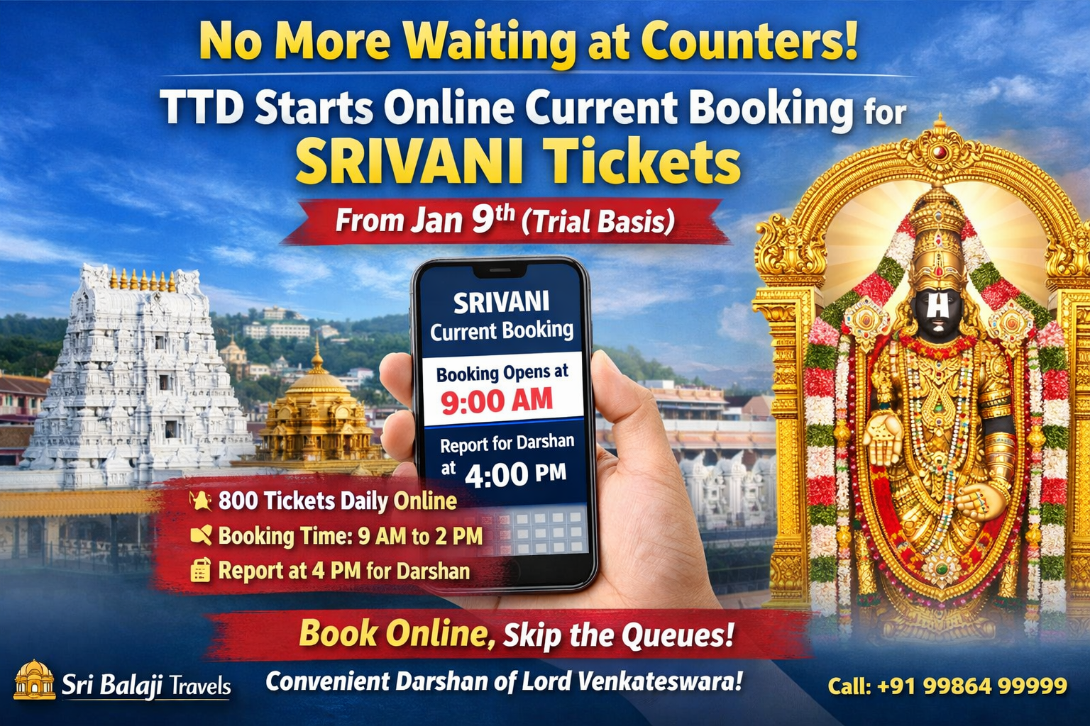 In a major relief for devotees visiting Tirumala, the Tirumala Tirupati Devasthanams (TTD) has introduced an online current booking facility for SRIVANI Trust Break Darshan tickets. This new system will be implemented on a trial basis starting from 9th January 2026, aiming to eliminate long queues and waiting hours at Tirumala counters.