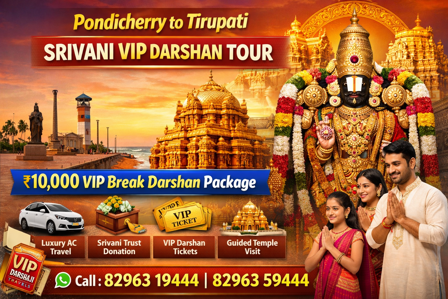 Planning a divine journey from Pondicherry to Tirupati for VIP Tirupati Darshan? This complete guide explains everything you need to know about SRIVANI Darshan Booking, ₹10,000 VIP Break Darshan, and how Sri Balaji Travels makes your pilgrimage smooth, fast, and hassle-free.