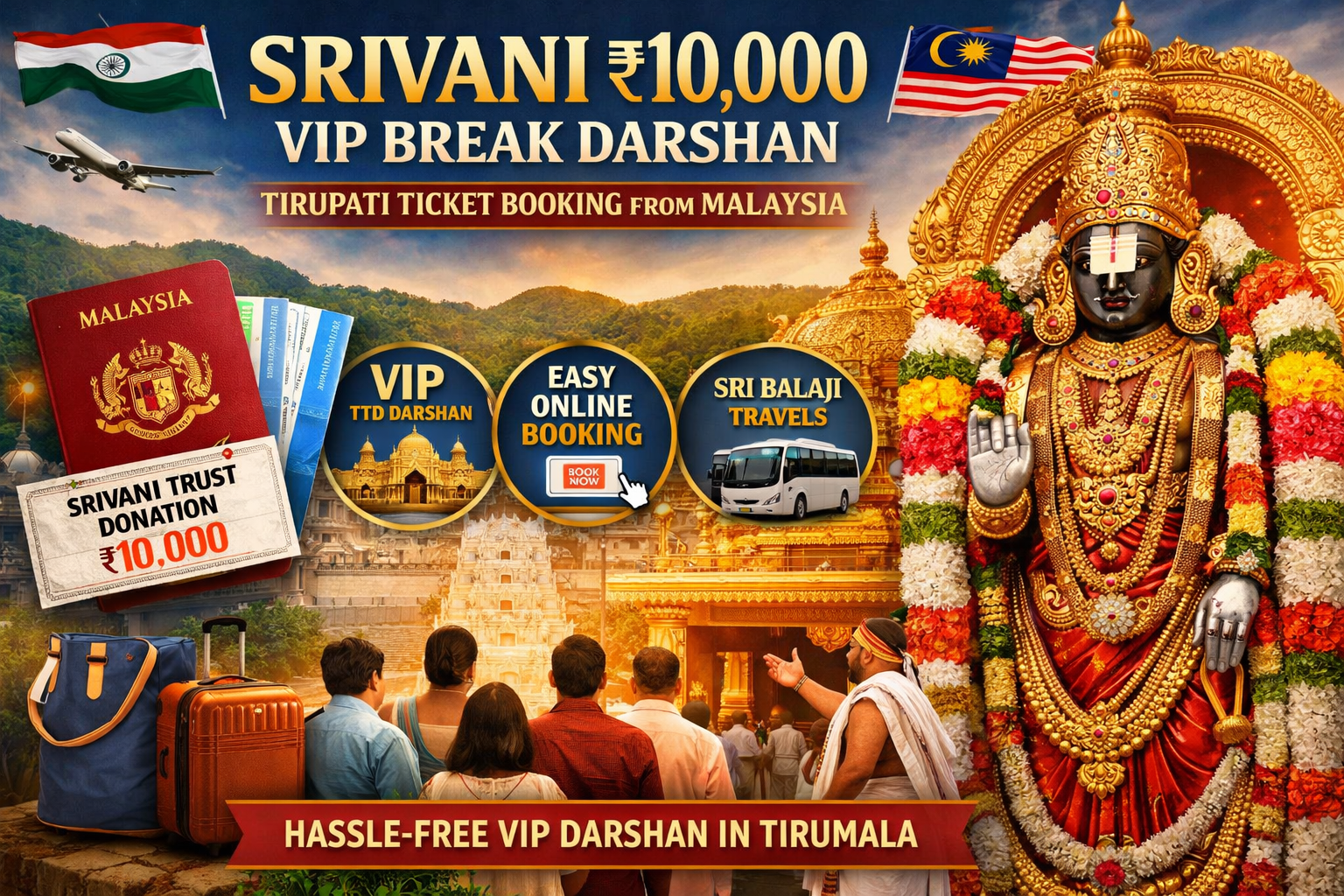 Devotees from Malaysia planning a divine visit to Lord Venkateswara at Tirumala can now experience a smooth and privileged darshan through the SRIVANI ₹10,000 VIP Break Darshan. This special darshan option, introduced by TTD (Tirumala Tirupati Devasthanams) under the Srivani Trust, allows devotees to obtain VIP Tirupati Darshan with minimal waiting time by making a trust donation.