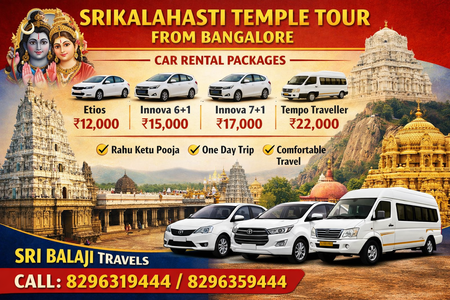 If you are planning a comfortable and hassle-free Bangalore to Srikalahasti Temple trip, Sri Balaji Travels offers reliable car rental packages with experienced drivers and transparent pricing.