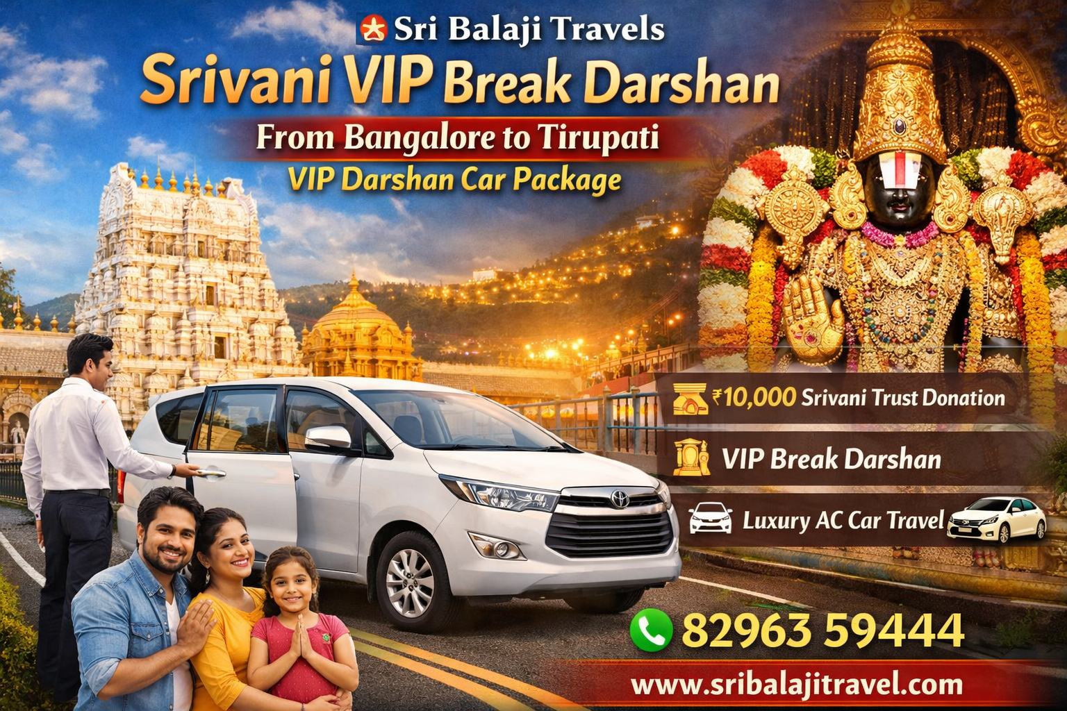 Planning a comfortable and hassle-free VIP Tirupati Darshan from Bangalore? The Srivani VIP Break Darshan Online Booking Bangalore – Tirupati VIP Darshan Car Package by Sri Balaji Travels is the most preferred option for devotees who want quicker darshan at Tirumala with proper guidance and smooth travel arrangements.