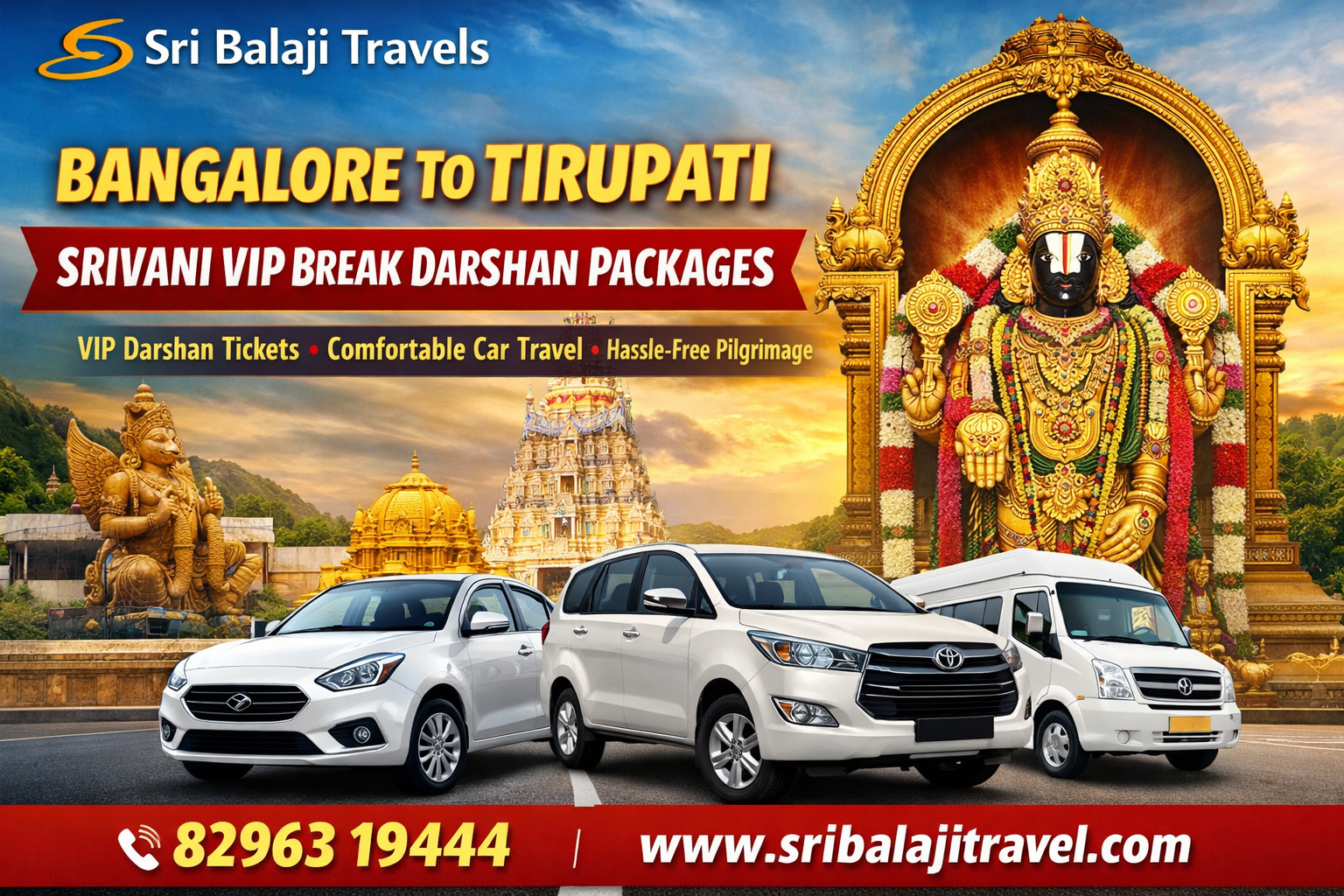 Contact Sri Balaji Travels today to reserve your Bangalore to Tirupati Srivani VIP Break Darshan package by car and experience the blessings of Lord Venkateswara without hassle.
