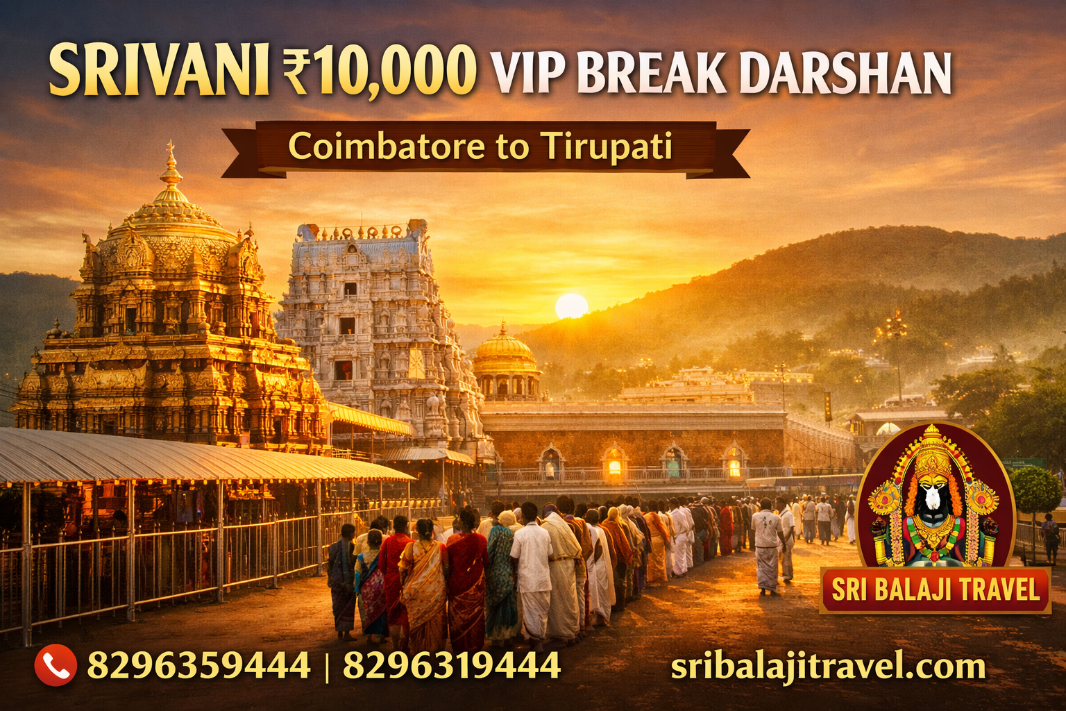 This blog explains everything about SRIVANI VIP Break Darshan tickets booking from Coimbatore, eligibility, timings, donation details, and how Sri Balaji Travels helps devotees with complete tour packages.