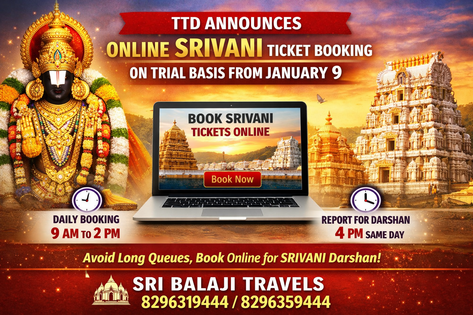 Keeping in view the convenience of devotees, Tirumala Tirupati Devasthanams (TTD) has taken a significant step by introducing an online current booking facility of SRIVANI Tickets from Jan 09 on a trial-basis. This new system will come into effect from 9th January 2026 onwards, aiming to reduce long waiting hours and bring more transparency to SRIVANI darshan bookings.