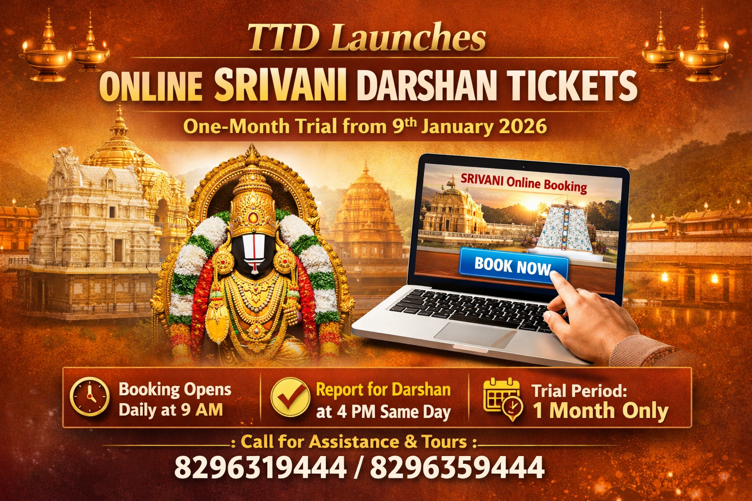 Keeping in view the convenience of devotees, the Tirumala Tirupati Devasthanams (TTD) has taken a significant step by introducing an online current booking system for SRIVANI Trust darshan tickets on a trial basis, which will come into effect from 9th January 2026 onwards.
