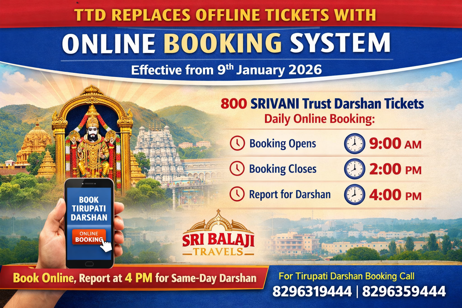 For hassle-free online Tirupati darshan booking, travel assistance, and latest Tirupati updates, Sri Balaji Travels continues to guide devotees with reliable and timely information. With years of experience in Tirupati travel services, Sri Balaji Travels helps pilgrims plan their journey smoothly in line with the latest TTD guidelines.