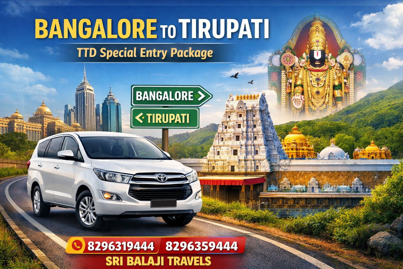 Planning a spiritual trip to Tirupati from Bangalore? Whether it’s a one-day visit or a complete tour, Sri Balaji Travels offers the most convenient and comfortable Bangalore to Tirupati car packages with TTD Special Entry Darshan tickets. This ensures a hassle-free journey so you can focus on the divine experience of visiting Tirupati Balaji.