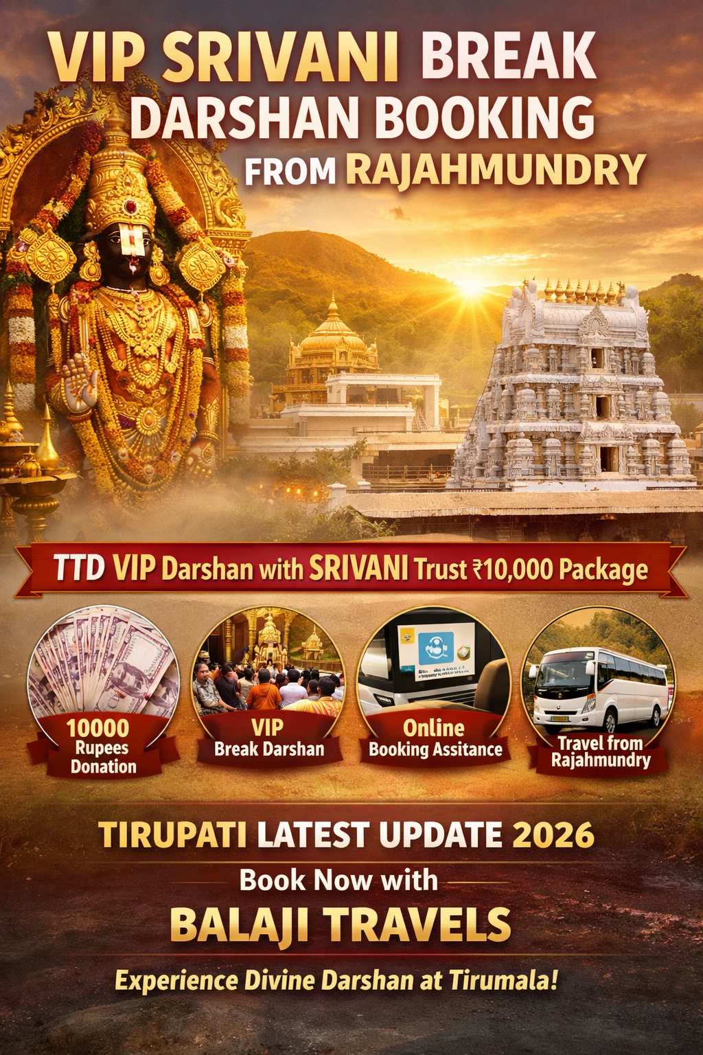 If you are looking for a trusted and guided SRIVANI VIP Break Darshan booking from Rajahmundry, Balaji Travels is here to help. Get the latest updates, accurate booking assistance, and complete travel support for your Tirupati pilgrimage.