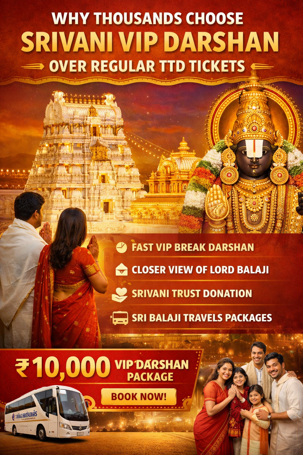 In this guide, we explain why thousands choose Srivani VIP Darshan over regular TTD tickets, how the system works, and how Sri Balaji Travels assists devotees with smooth Srivani Darshan booking and travel arrangements.